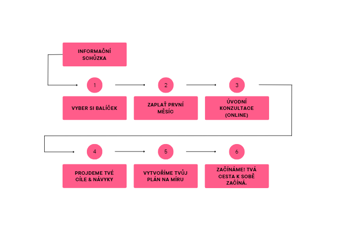 Vyplníš dotazník na našem webu, kde zaškrtneš, že si chceš domluvit konzultaci. My tě následně kontaktujeme a domluvíme si termín informativní schůzky, kde si v klidu popovídáme o tom, co potřebuješ, jaké máš cíle a jaký balíček by ti nejlíp seděl.